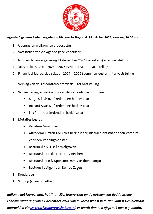 Agenda Algemene Ledenvergadering 29 oktober 20.00 uur